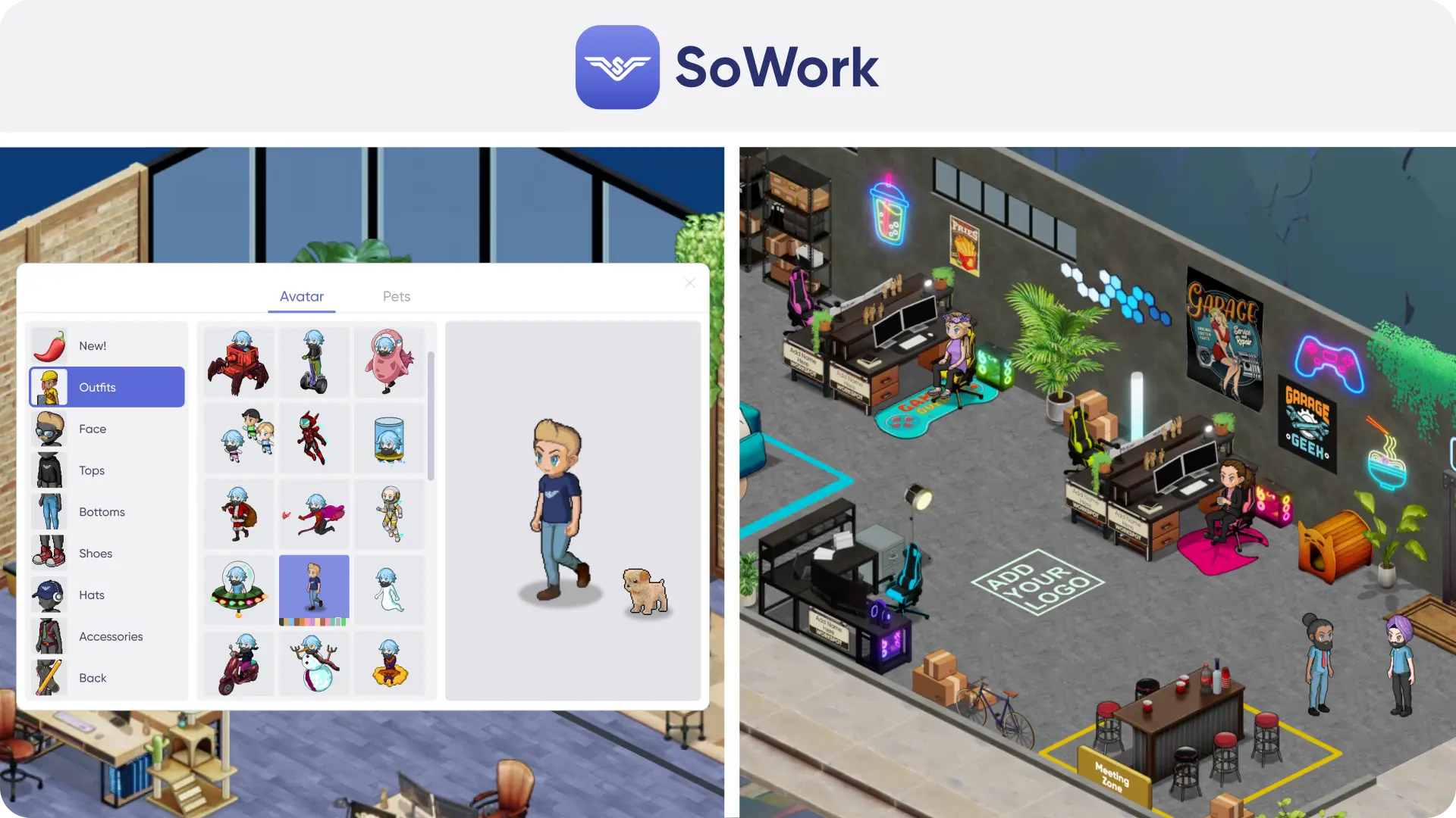 SoWork – Offers a 2.5D isometric world with a Sims × Animal Crossing aesthetic and vibrant, customisable environments. Users can decorate offices, place furniture and design custom maps. The Simplified Mode presents a cleaner, non‑world interface.