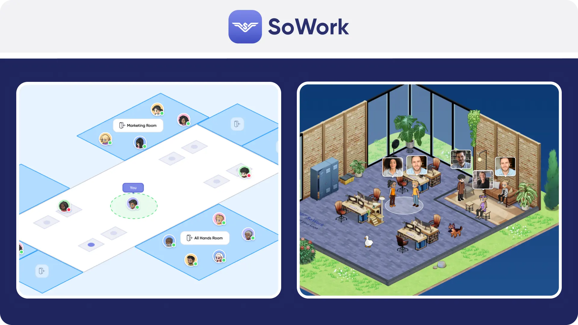Customization | Build custom maps, place furniture, decorate rooms; free custom map for Premium teams >30. | Quick-start templates and full workspace customization; fun objects like go‑karts. | Both offer custom layouts; SoWork provides custom map migration for free. |