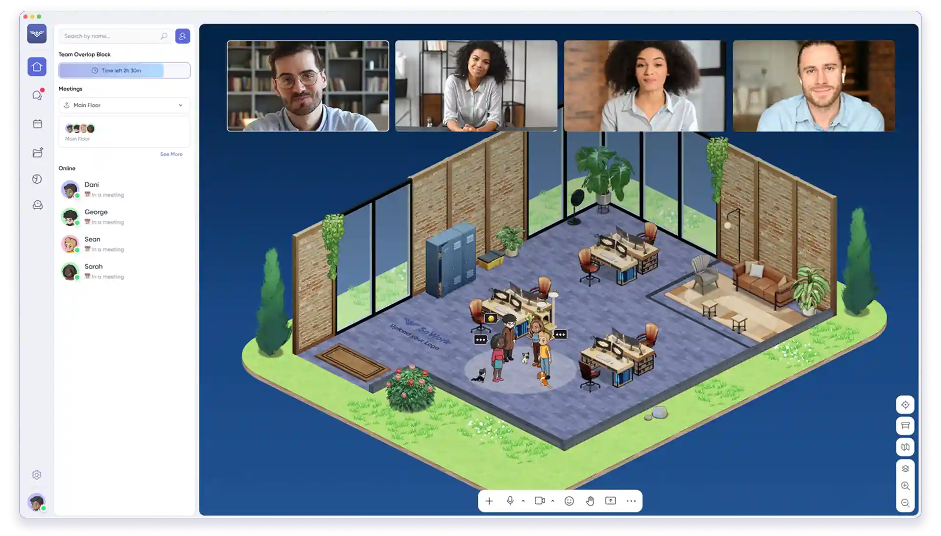 Time to start a meeting – In SoWork, walk up to a colleague’s avatar or click their name to start a video call. Gather users can instantly join conversations by clicking a colleague in the virtual office.