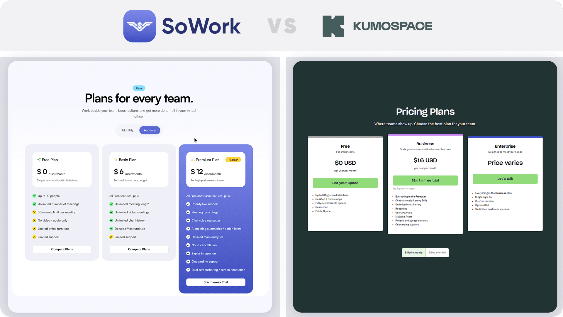 Pricing clarity – SoWork clearly lists Basic ($6/user/month monthly, or $5.40/user/month annual billing) and Premium ($15/user/month, or $12/user/month when billed annually). Kumospace pricing is generally transparent on their website but often split by specific feature sets or floor capacities.