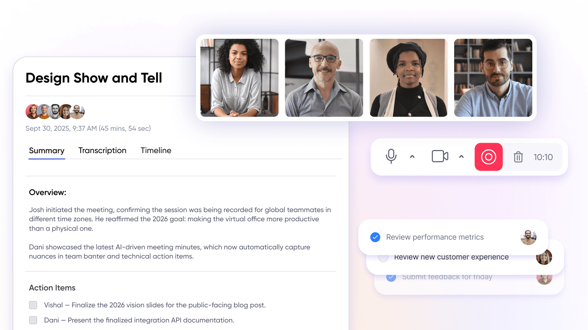 New AI summaries distribute automatically across team communication channels, maintaining alignment for team members who couldn’t attend. Rather than sending lengthy meeting recordings that no one watches, AI summaries provide concise overviews highlighting decisions made and next steps assigned.