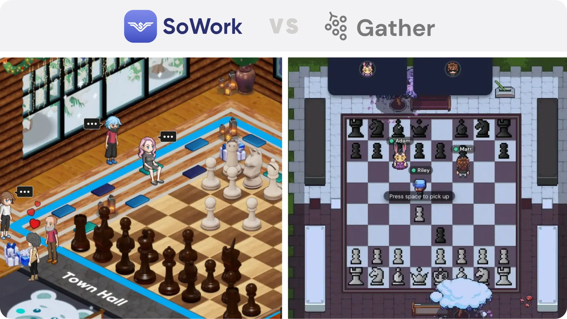 So both products encourage team engagement and bonding. But Gather Town focuses on fun and social for the sake of... fun and social. While SoWork integrates play and bonding into work to drive team performance.