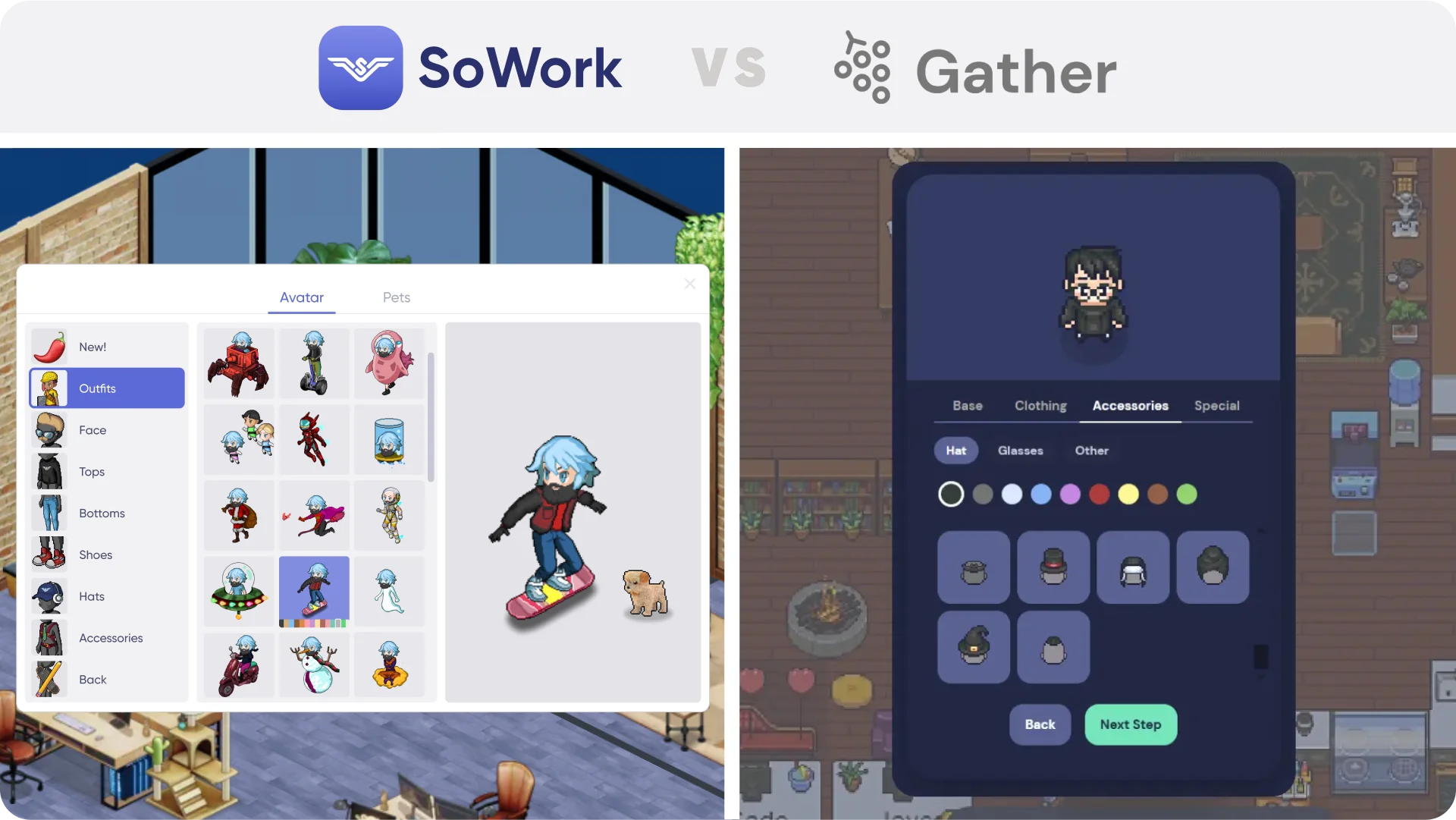 In the virtual office, your character represents... you! So both Gather Town and SoWork allow you to customize how you look.