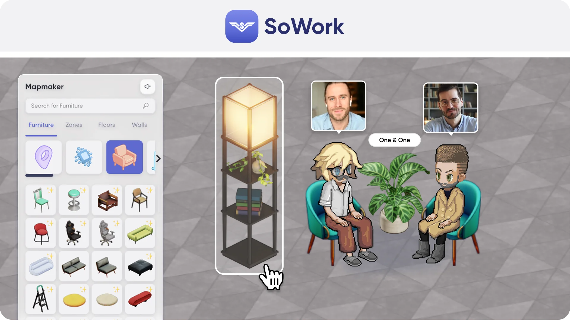 Gather Town and SoWork offices are fully customizable. Both apps have: