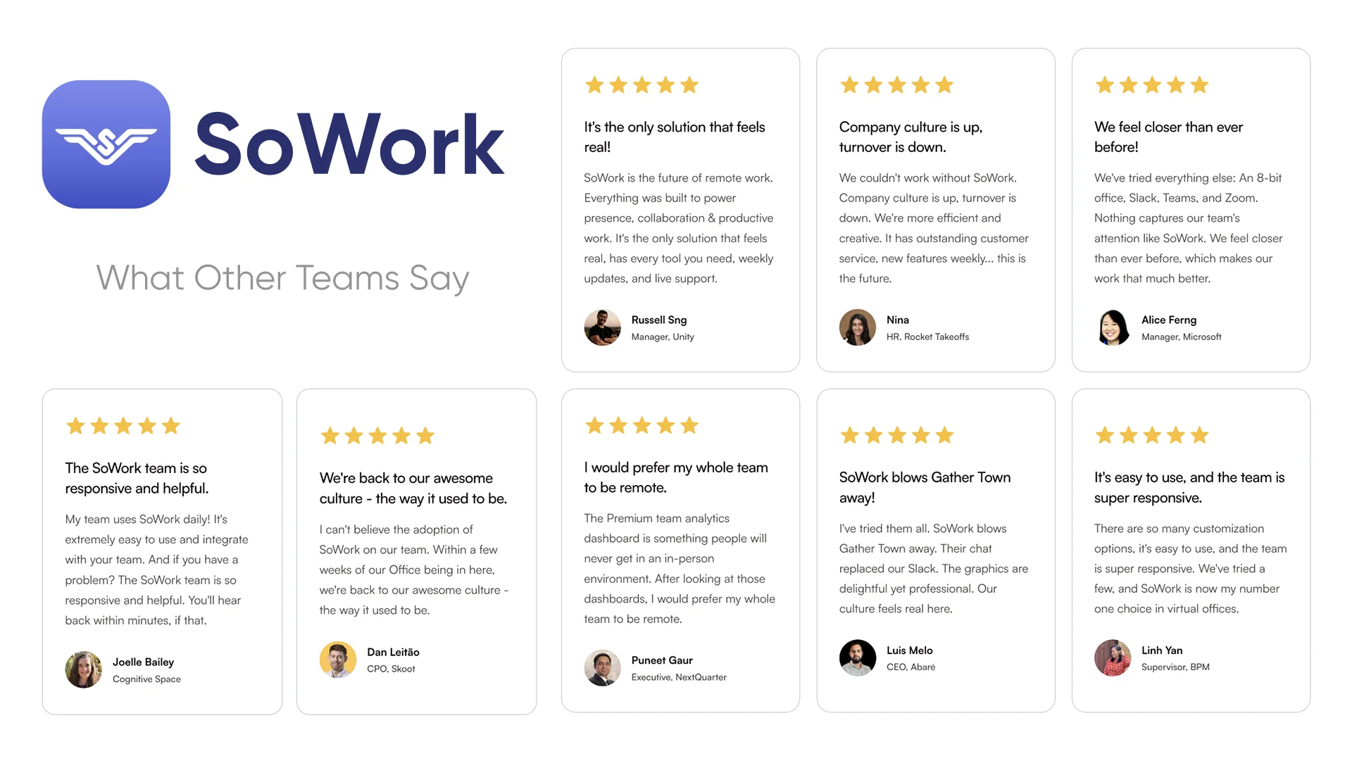 Teammates in SoWork can leave gifts, celebrate, and express their company pride in ways that just aren't possible in other products, SoWork makes virtual experiences feel like in-person human moments.