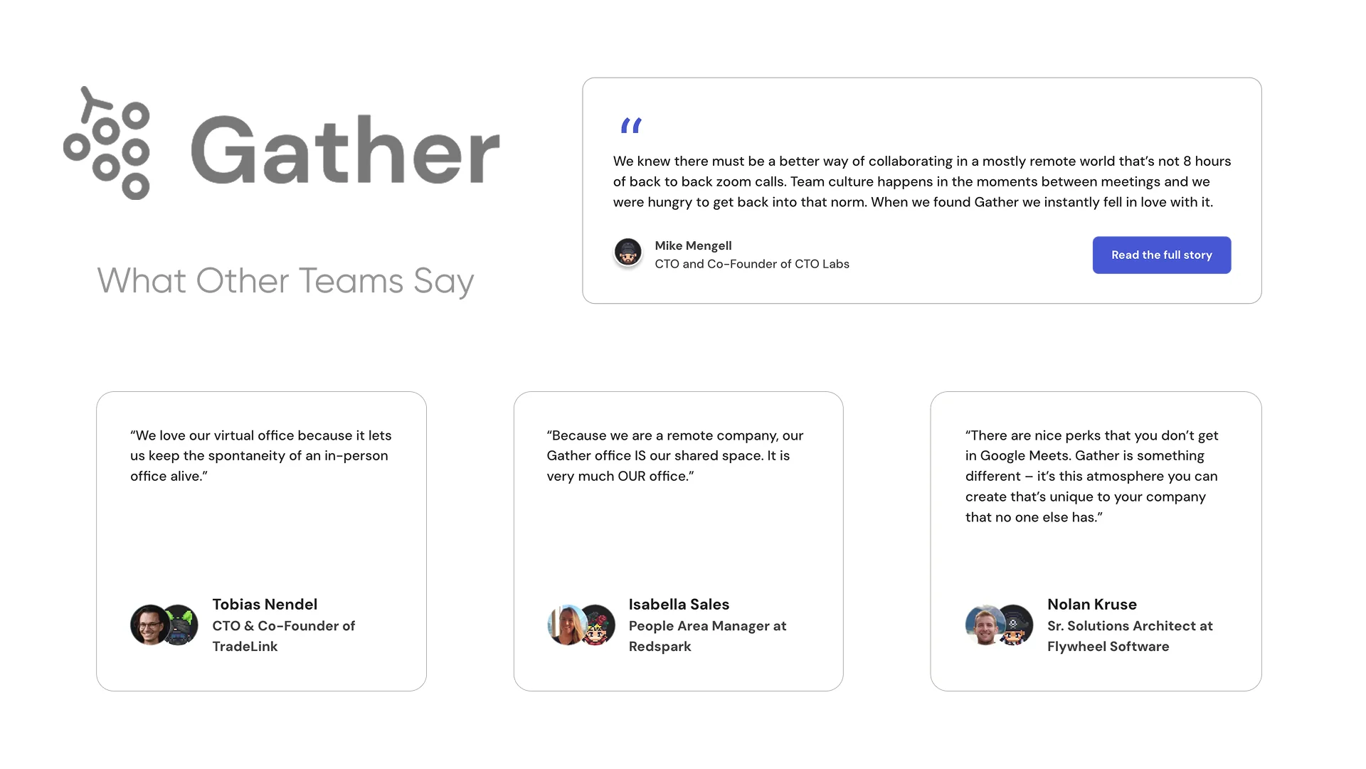 The Gather team originally created Gather Town during the pandemic for events and social gatherings (get it, ‘gather’?!). When socials and events returned to in-person but remote work persisted, they pivoted the product to focus on work.