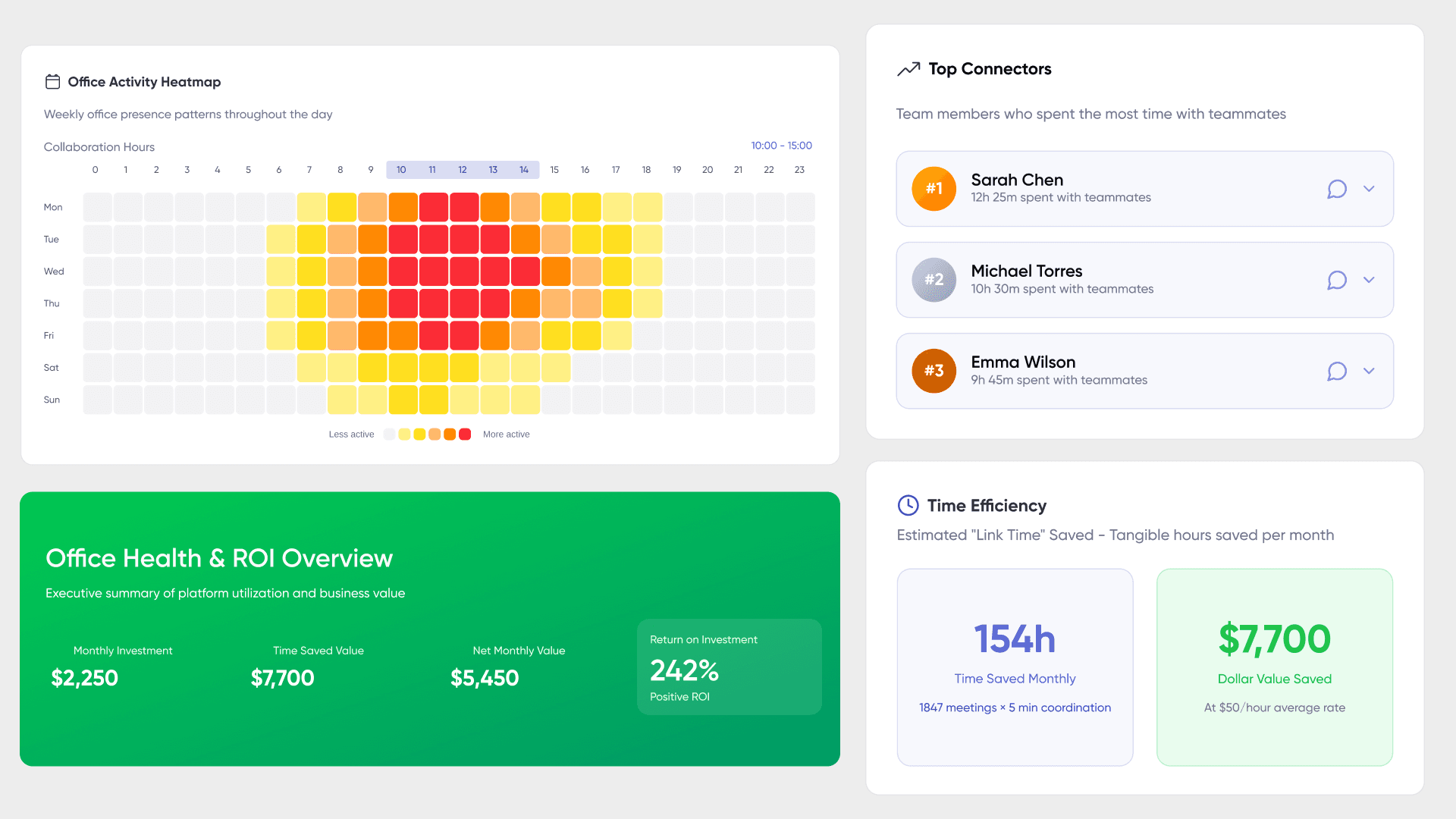 These communication analytics connect directly to presence tracking: understanding when people are available enables better scheduling, while interaction analysis reveals whether availability translates into actual collaboration.