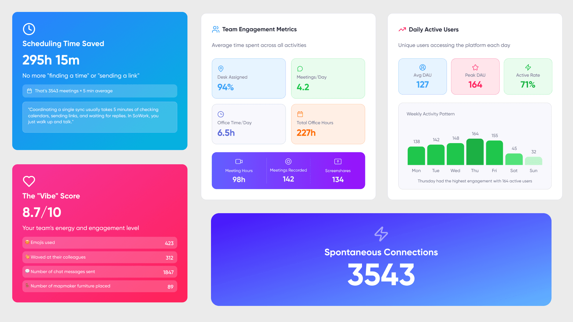 With SoWork, team members can see who is online, walk into each other’s offices, and drop into meetings seamlessly. Quick questions no longer require scheduled calls, and collaboration happens in real time.