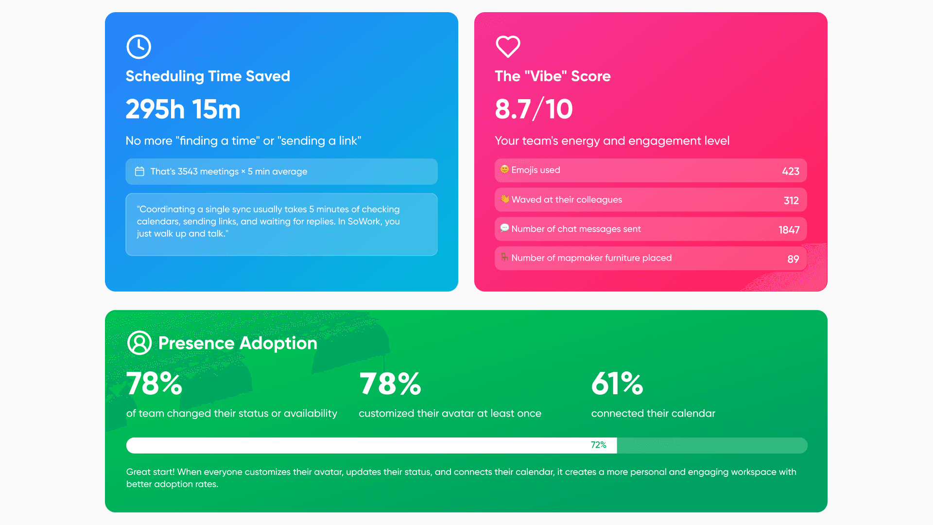 The team adopted SoWork as their persistent virtual office, creating a central hub where employees could see who was online, pop into rooms for quick collaboration, and join meetings seamlessly.