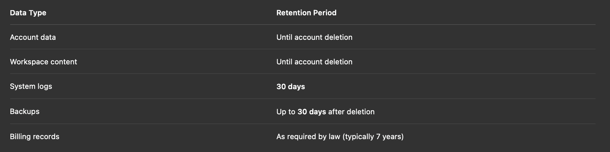 After deletion requests, data is removed from live systems and from backups within 30 days.