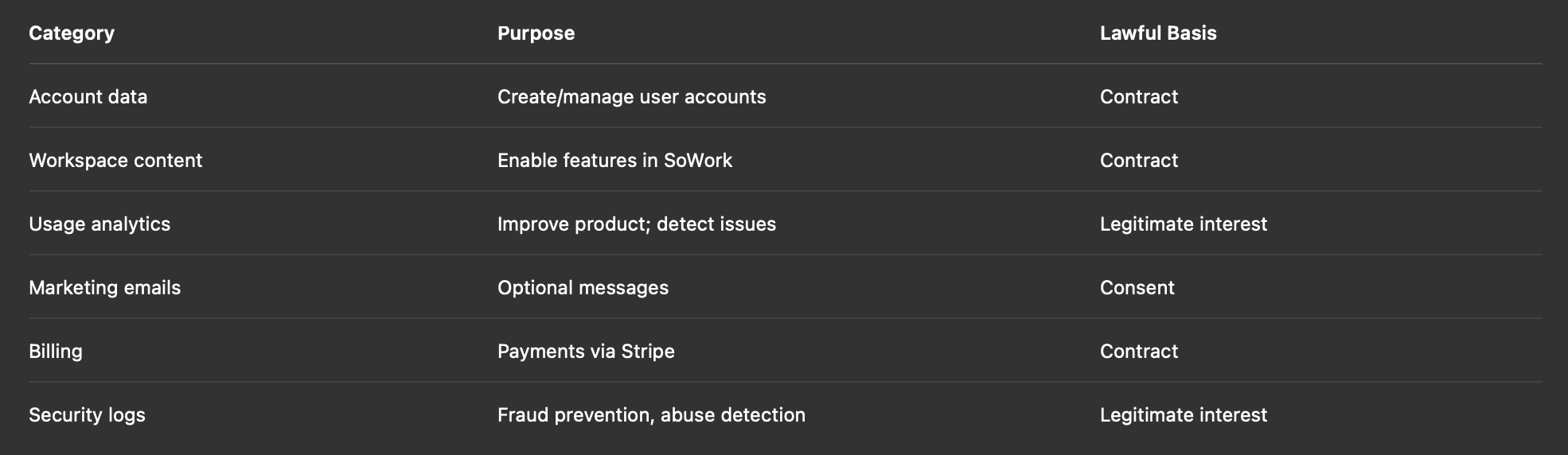 We collect only the data required to provide and improve SoWork. Below is a summary: