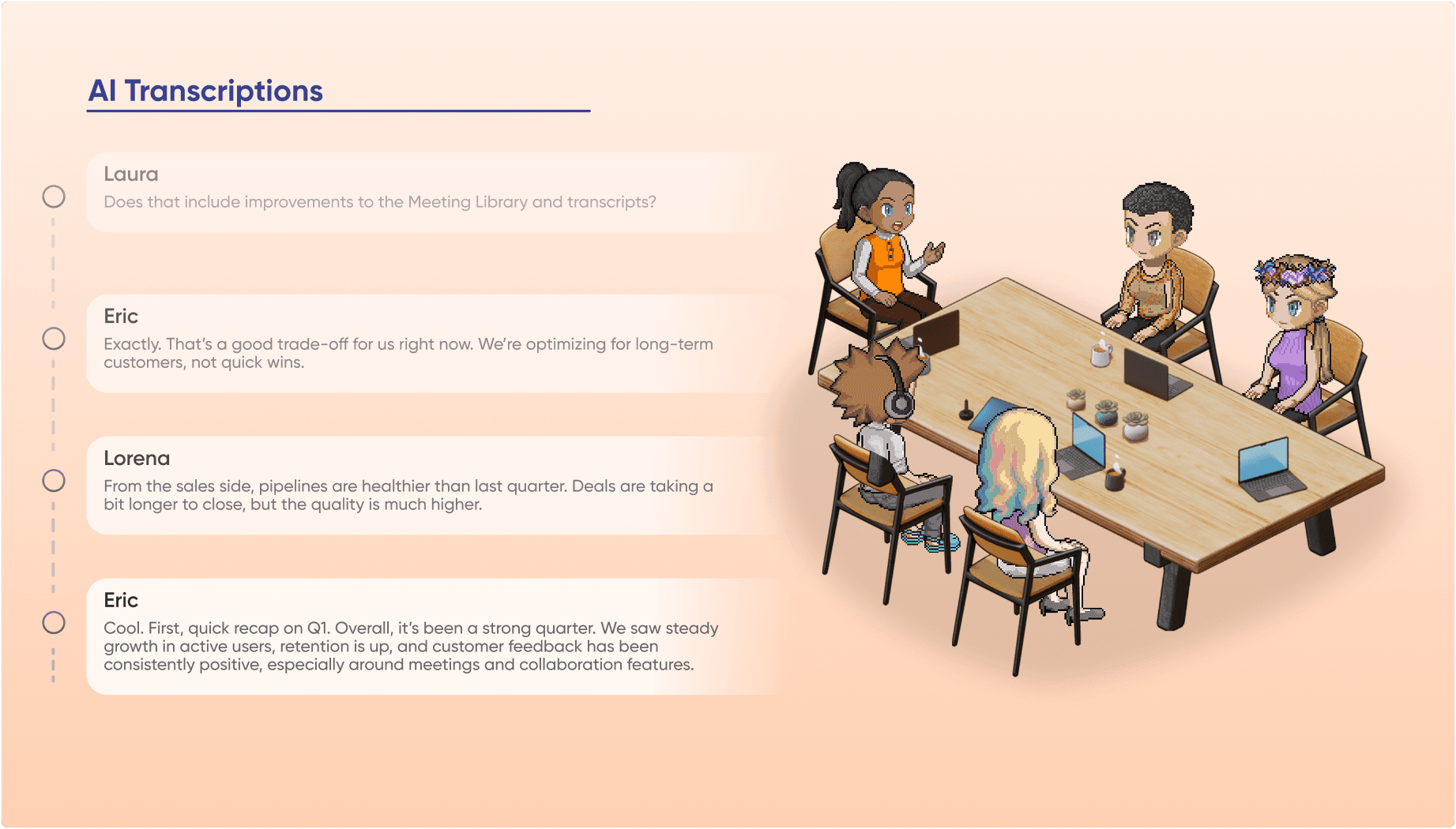 Get detailed transcripts of your discussions, complete with participant names. Perfect for referencing decisions, tracking conversations, or providing teammates with updates.