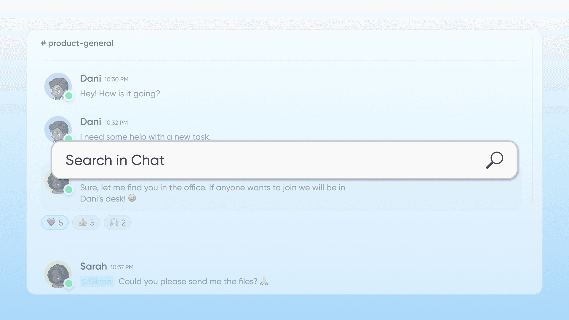 Search across all channels, direct messages, files, and people from one place. Find what you need in seconds.