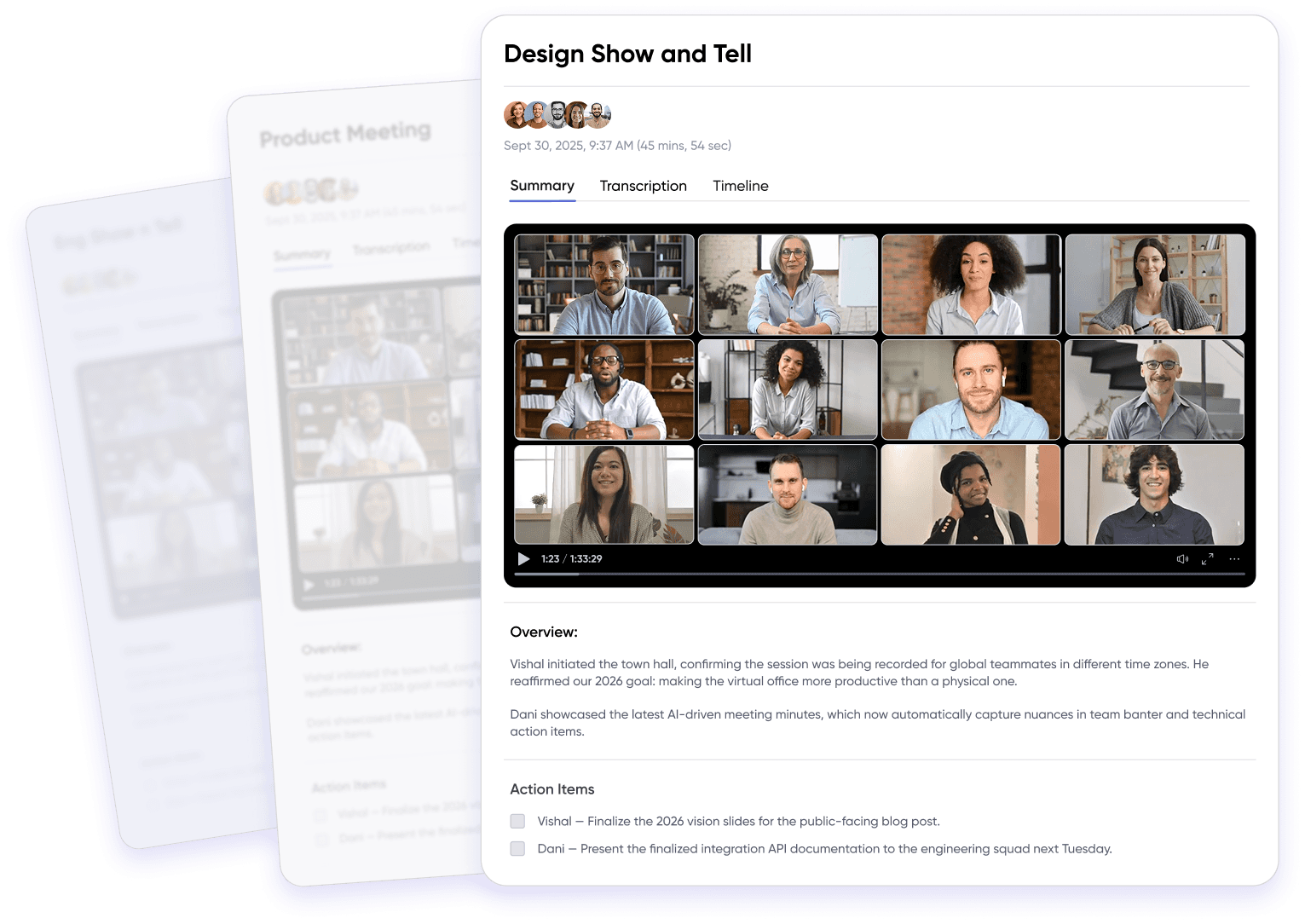 Deploy Meeting AI across every department to ensure a consistent source of truth. Summaries and action items are automatically centralized in the Meeting Library, allowing leadership to stay informed on project status without attending every call.