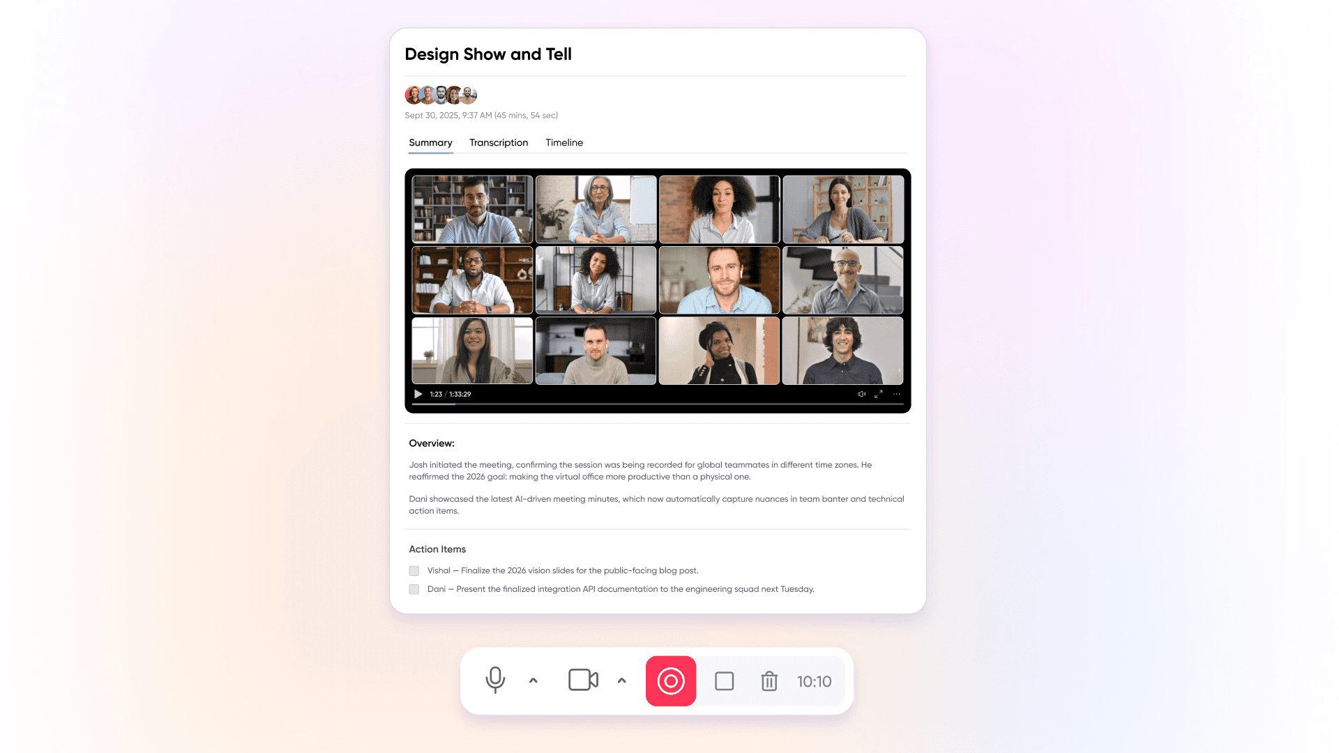 Use Meeting AI to ensure no brilliant idea is lost. From investor pitches to technical grooming, every meeting generates a summary and action items in your Meeting Library, keeping your lean team perfectly aligned.