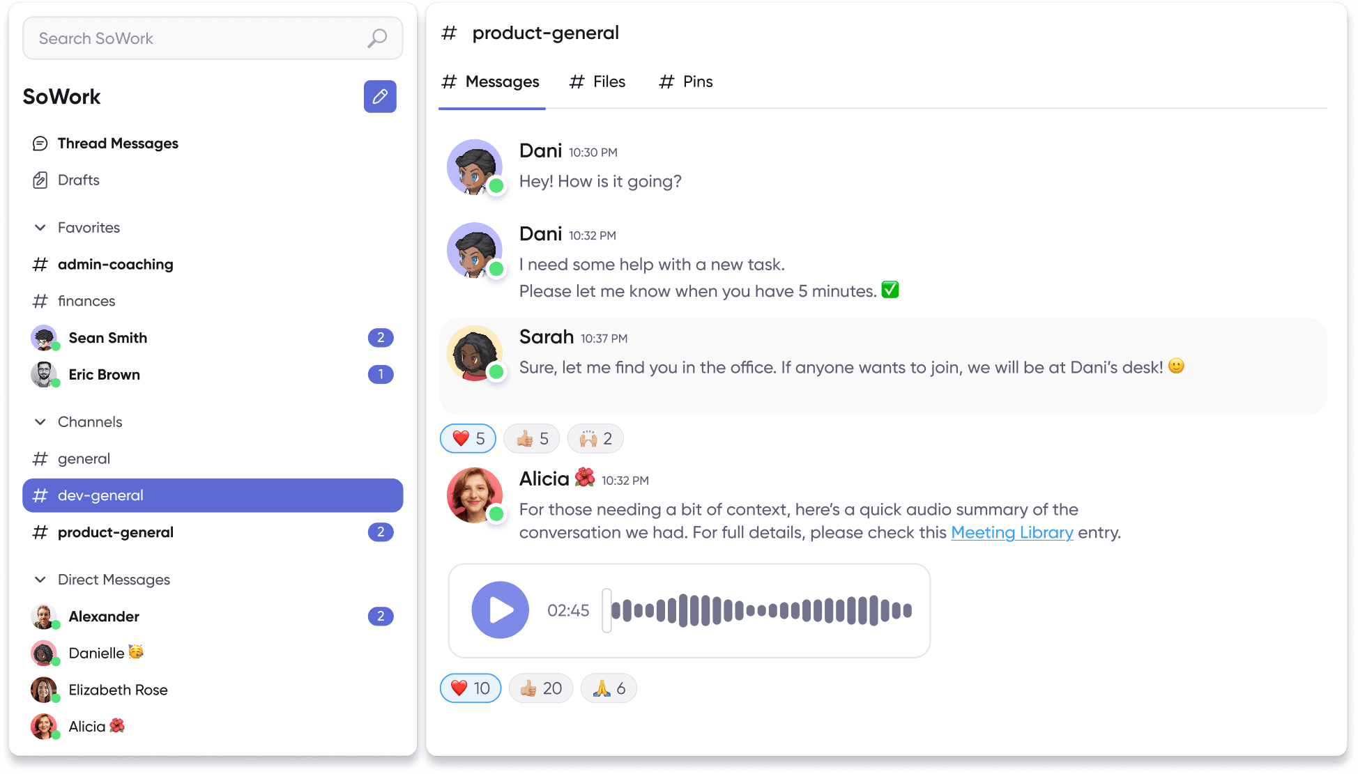 Organize your squads into channels for marketing, product, and fundraising. Use voice messages for high-context updates that allow your team to listen and act while staying focused on their core tasks.
